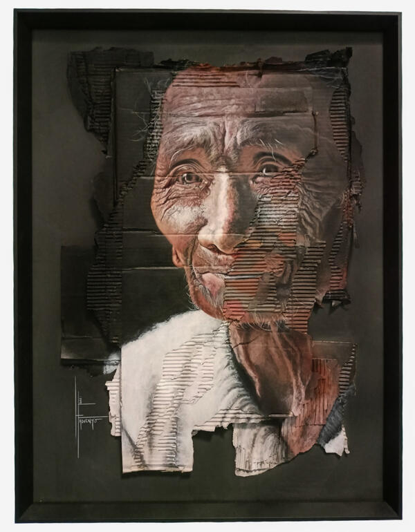 Des portraits de personnes souvent marquées par la vie, dont les regards profonds et puissants nous parlent. Le réalisme et la brutalité du support nous rapprochent d'eux... Comme s'il ne nous restait qu'à tendre l'oreille ou la main pour faire connaissance. Des formats et supports pensés sur mesure pour chaque personnalité unique et pourtant non réelle, ici représentées.